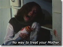 Sarah discovers the Abominations infesting her house, and her son feeding them shards of human flesh and entrails. Crazed with fear and despair, she calls on God to help her. Cody stands emotionless, merely licking his lips, as one the Abomination's mouths attaches itself to her hand and bites it clean off. Strangely, the monsters will attack the person who is basically their mother, but they don't hurt their feeder. Sarah dissapears completely as the horror devours her. Later, wanting revenge against Brother Fogg, Cody plants one of the young creatures in Fogg's bathroom before he takes a dump. We've already seen that the old man practically lives there, in one of the film's few comic scenes. The hunger of the monsters increases and we see Cody pitchforking in great armfuls of bloody flesh and entrails into the chewing maw of the Abomination that lives in the pantry. Over and over we hear when he's stalking someone the chant in Cody's distorted voice ... "The Abomination, which makes all things desolate", inspired by the Bible. Finally a concerned Kelly wants to find out what her lost boyfriend has been up to. She enters into a charnel house from Hell as she views the human fragments left around the kitchen, and the many-toothed things bloodily gaping for more. Cody enters the room and attacks his once-lover, barely recognising her. Kelly finds a shovel and attempts to defend herself. What will this gruesome battle reveal about Cody and his evil spawn, and will Kelly survive in one piece or be sucked into the abyss? Beyond the horror that we see, is it all happening in Cody's mind as his tale concludes with the Psychiatrist?
