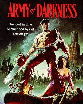 Ash is a mutilated hero, with a chainsaw attached to his missing hand - lost in the battles of ED2 - but he can still throw a wisecrack with the best of them. Even when he's thrown into a medieval nightmare of slavery, courtesy of the Necronomicon, book of the dead. In an unnamed country ravaged by the demons of the first two films, two kingdoms are at war, and Ash is assumed to be in league with "Eric the Red", one of the warring Kings. Thrown into a pit infested with "deadites", Ash kills them both and crawls his way out. Proving himself to be an independent warrior and also the one foretold in a prophecy, who would destroy the evil dead plague, Ash is finally welcomed into the kingdom and given a task - to retrieve the Necronomicon and say three words correctly. Klaatu Varata Nikto...