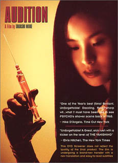 I usually reveal a lot more about plotlines (sometimes too much) but I can't do it this time - it's really that important that you're not aware of what's to come. Director Takashi Miike has crafted a cunning journey that turns itself upside down towards the end, even though it's given us clues as to where it's heading. I can't say I love this film, but I certainly appreciate it's power to haunt and digust. Even horror fans may find the last "act" disturbing. I wouldn't recommend this one if you're into horror-lite - you'll need a strong stomach, but if you can subject yourself to it, you'll come away with a lot to think about relationships, miscommunication, the miseries of child abuse and the total mystery of another person.